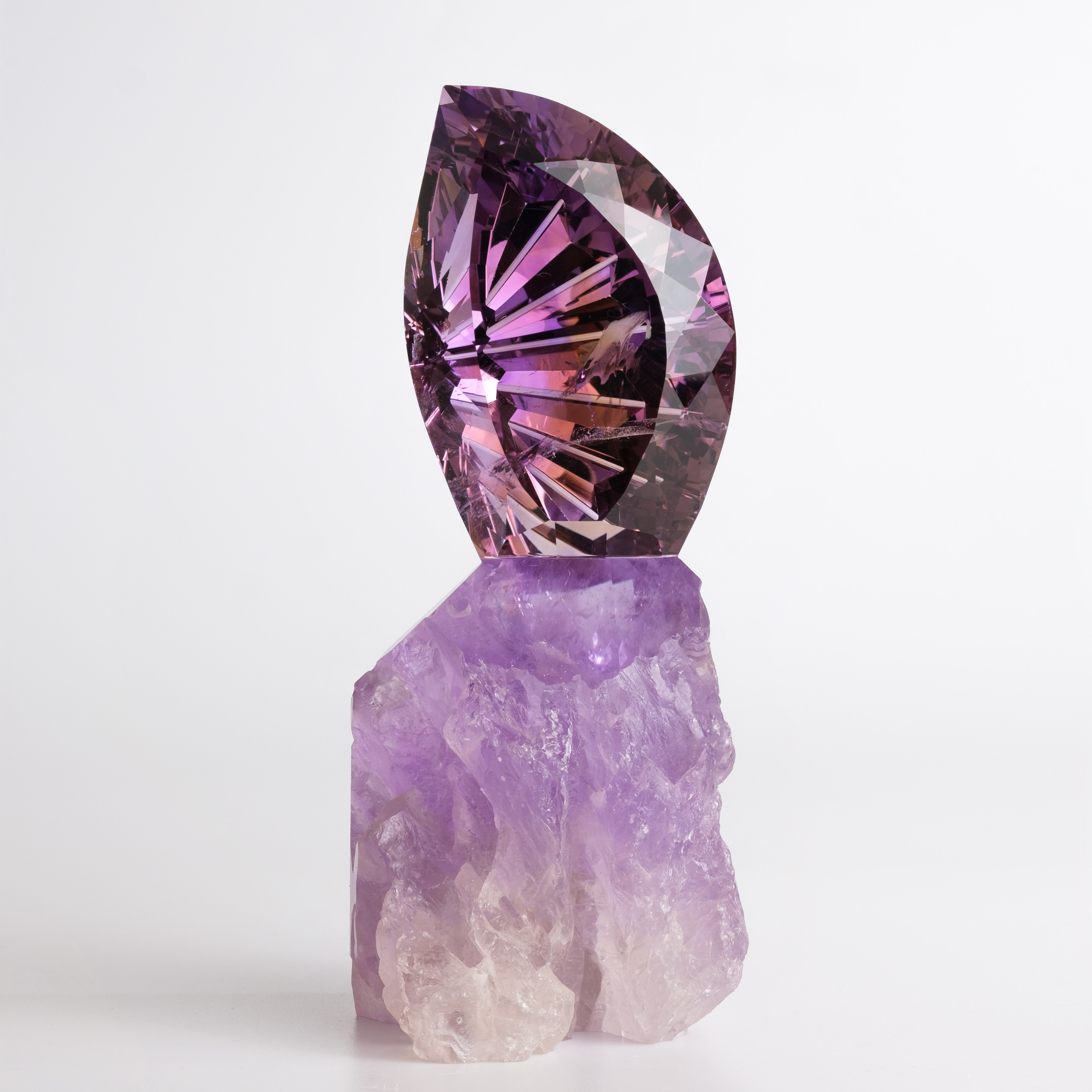 Объект «Свеча на ветру» – это аметриновое пламя, сотворенное руками уральского огранщика Владимира Силина. Впервые оно зажглось для жителей и гостей Москвы на конкурсной выставке «Мастера России» в 2024 году. Работа была отмечена Дипломом первой степени в номинации «художественная огранка». В Екатеринбурге объект «горит» – экспонируется – впервые на юбилейной выставке автора. Внутри ограненного в форме язычка пламени кристалла аметрина множество колюче-искристых включений, преображающих и приумножающих свет. Вместо оплывшего воска свечи – матовое марево сложной природной формы камня.